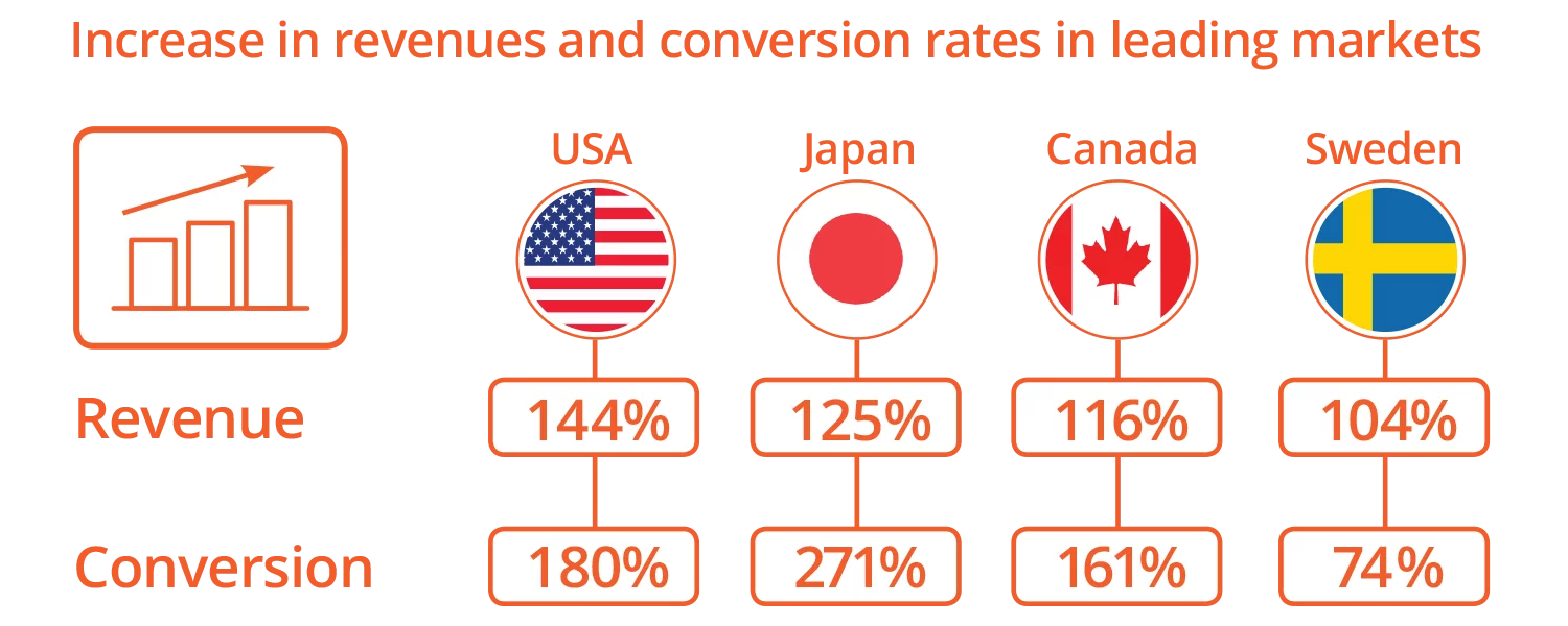 Providing international shoppers with a fully localised online shopping experience tailored to shopper preferences and behaviours has a significant effect on checkout conversions: In Canada, for example, where online revenues have increased 116% and conversion rates have increased 161%, 100% of shoppers choose to purchase in Canadian Dollars and 94% opt to prepay the local duties and taxes at checkout. In Japan 98% of customers choose to buy in Japanese Yen and 86% of them prefer to pay their duties and taxes at checkout.