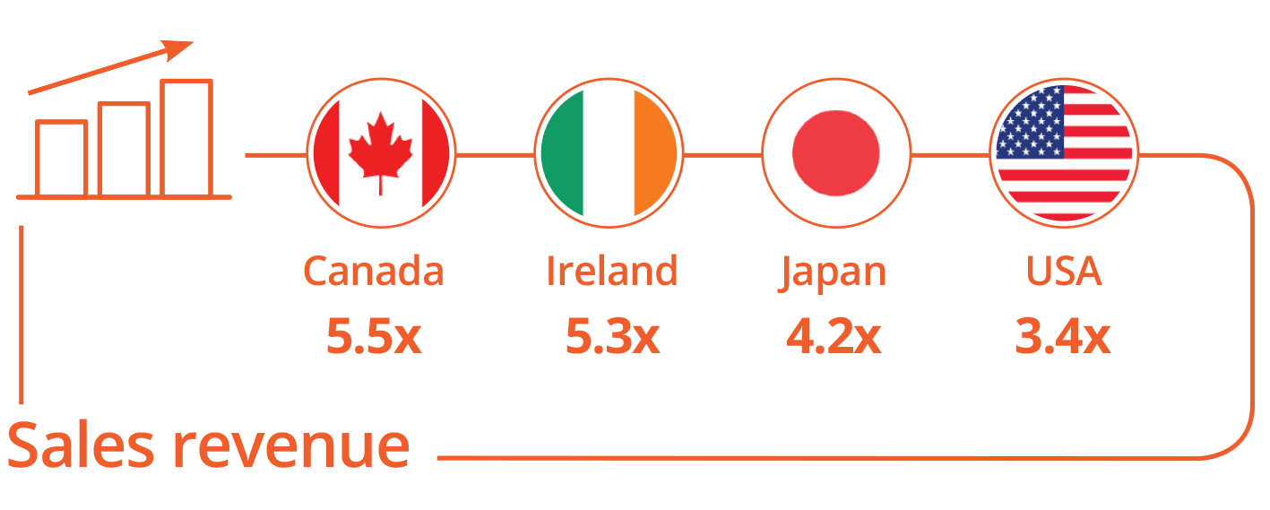 In Ireland, for example, Sigma Sports saw sales revenue increase by 5.3x, in the USA by 3.4x and in Japan by 4.2x.