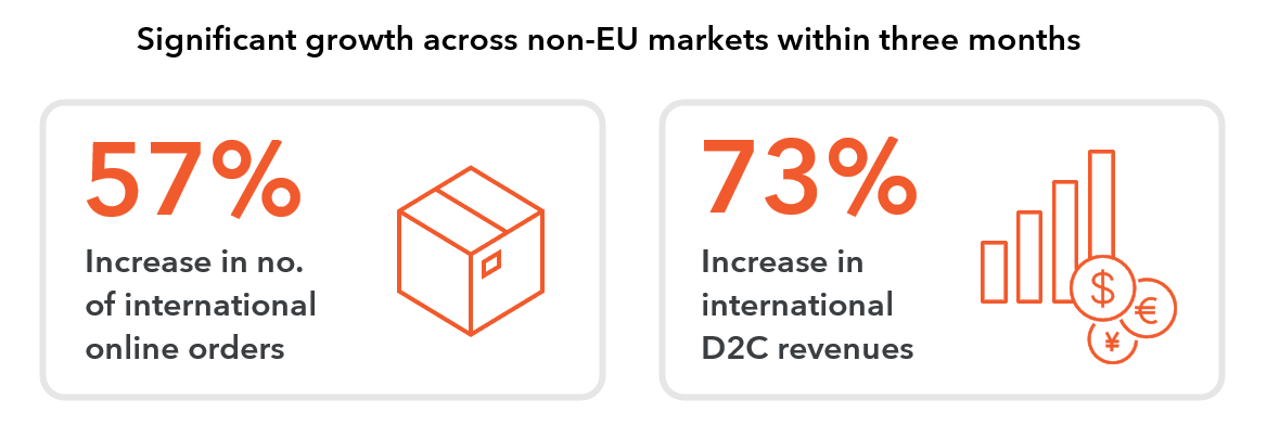 Across its non-EU markets, the brand saw substantial YoY increases in overall international online orders and international D2C revenues.