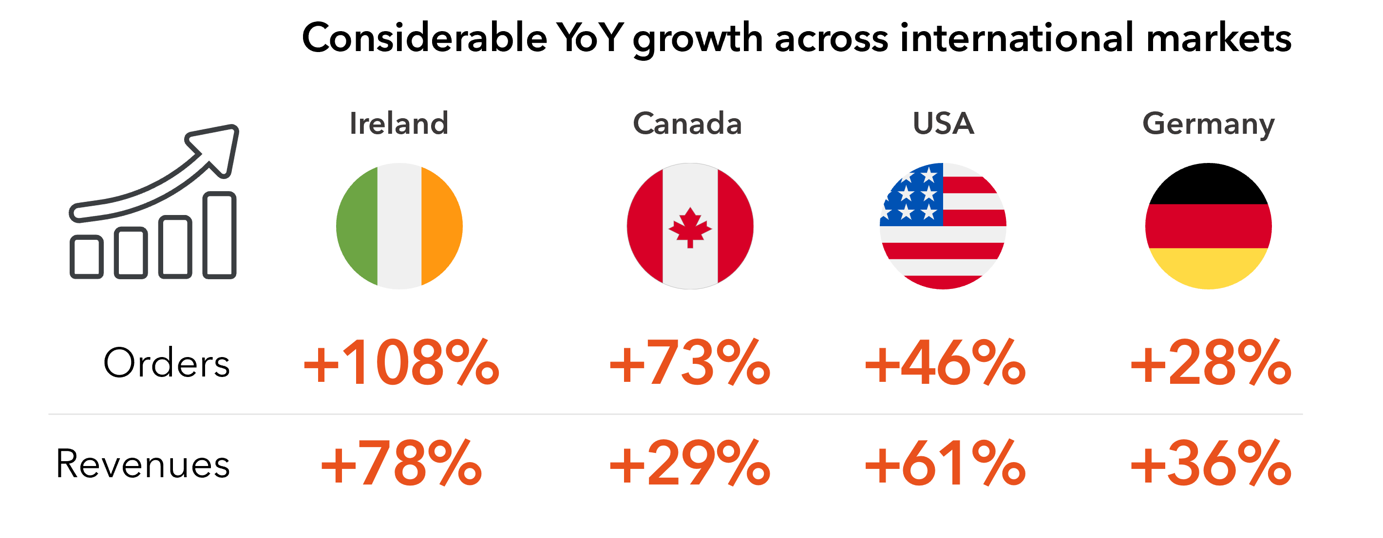 Overall, the number of orders in these markets rose by 48% YoY and revenue rose by 50% YoY.
