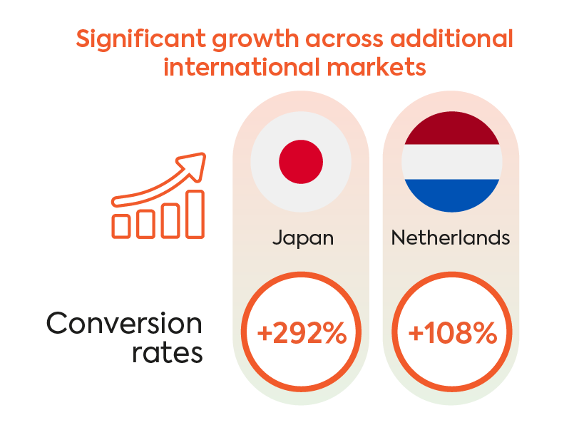 By offering customers an optimal localised experience tailored to local market preferences, Ryderwear boosted conversion rates in additional international markets. In the Netherlands, for example, where conversion rates rose by 108%, 48% of shoppers choose to pay with iDEAL, a leading local alternative payment method.